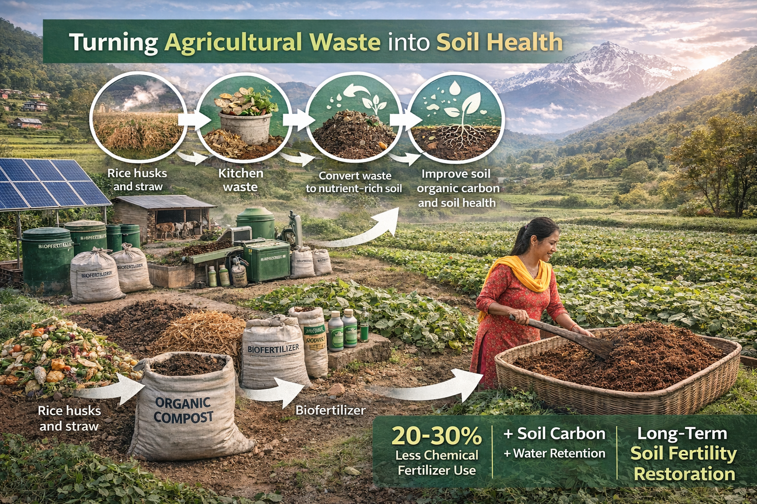 Nepal produces millions of tons of agricultural residues every year, including rice husks, crop straw, kitchen organic waste, and livestock manure. Much of this waste is burned or discarded, contributing to air pollution, greenhouse gas emissions, and nutrient loss.